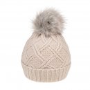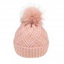 Ladies pattern knitted bobble hat with faux fur pom-pom.